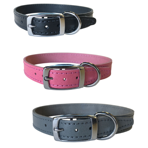 3/4″ (1.9cm) Wide with a choice of 8 colours in 2 sizes. Plain collars with stitching detail around the edges and silver hardware. Made using genuine high quality leather.
