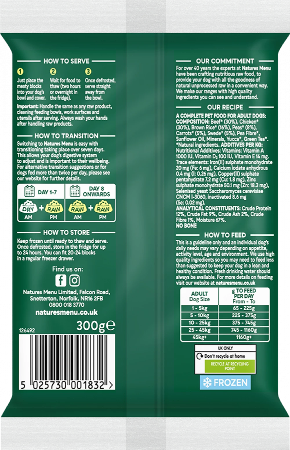 These tasty frozen chicken and beef dog food blocks will ensure you can enjoy worry-free natural feeding and mess-free meal times. Our experts are the ones that craft all our recipes and these raw beef & chicken blocks are made to FEDIAF standards. With no nonsense and no surprises (artificial colourings or preservatives), they have everything your dog needs, and nothing they don’t.