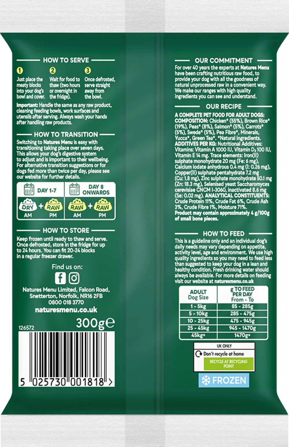 Wholesome and meaty raw 60 40 dog food blocks made with chicken and salmon. A healthy, complete and nutritionally balanced raw meal for dogs. Pack size 300g.