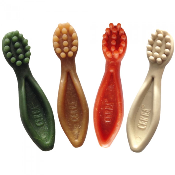 Antos Cerea Toothbrush dog chews are 100% natural dog snacks made from compounded vegetable fibers with natural. Colouring and minimal fat content. The toothbrushes are completely edible and have a unique texture that helps to remove plaque and tartar from your pets’ teeth as they chew. They are Wheat and Gluten free.