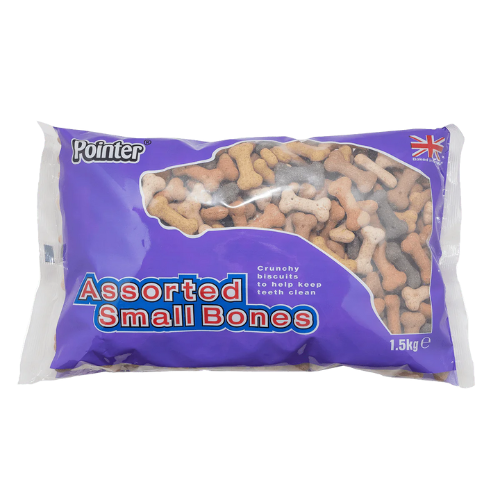 Pointer Assorted Small Bones are crunchy wheatmeal biscuits to help keep teeth clean.