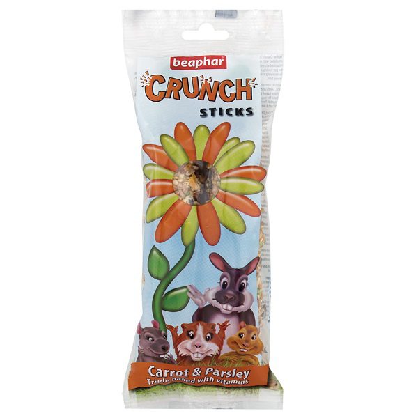 Beaphar Carrot & Parsley Crunch Sticks are a delicious, nutritional treat for small animals, designed to provide your pet with natural enrichment and to help prevent boredom. The sticks are formulated with high-quality ingredients, including grains, seeds and vegetables. With added Vitamin A, B, D and E, and folic acid, to help support optimum health and healthy skin. Beaphar Crunch Sticks are triple baked to ensure they are extra hard to support the natural wearing of the teeth. In the wild, rabbits and rodents will spend hours foraging for food, eating and chewing on wood or bark. Beaphar Crunch Sticks can help mimic this natural behaviour as well as satisfying your petās need to gnaw. The sticks have a natural wood centre which is chewable, and suitable for your pet to enjoy gnawing on long after they have finished the delicious grains, seeds and vegetables. In addition, Beaphar Carrot & Parsley Crunch Sticks provide a valuable source of antioxidants and support healthy vision. Suitable for rabbits, guinea pigs, chinchillas, hamsters and other small animals.