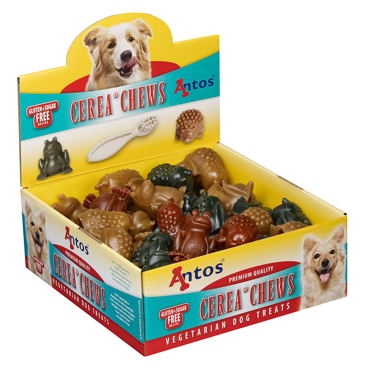 Made with vegetarian friendly ingredients, these dog chews make and ideal hypoallergenic treat. These frog shaped chews are designed to clean the teeth when chewed. Made with simple, easy and digest natural ingredients. They are also Wheat and Gluten free.