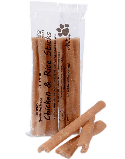 A Delicious Meat Treat Made With 90% Chicken Breast Meat! Burns Salami Chew Sticks are made with 100% Meat. There are NO Biscuit or Cereal Ingredients. That’s why our Chicken & Rice Sticks are WHEAT GLUTEN FREE and super tasty!