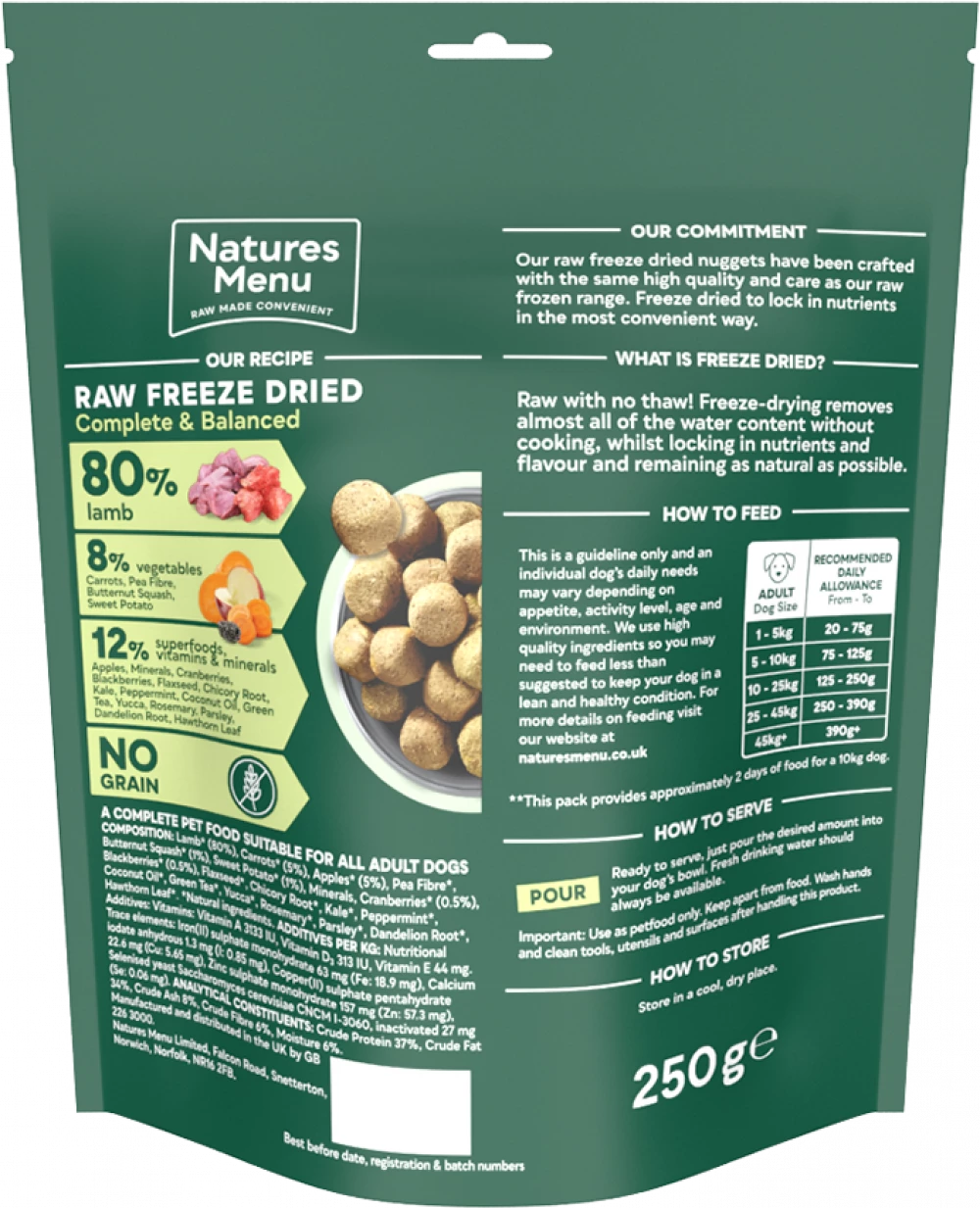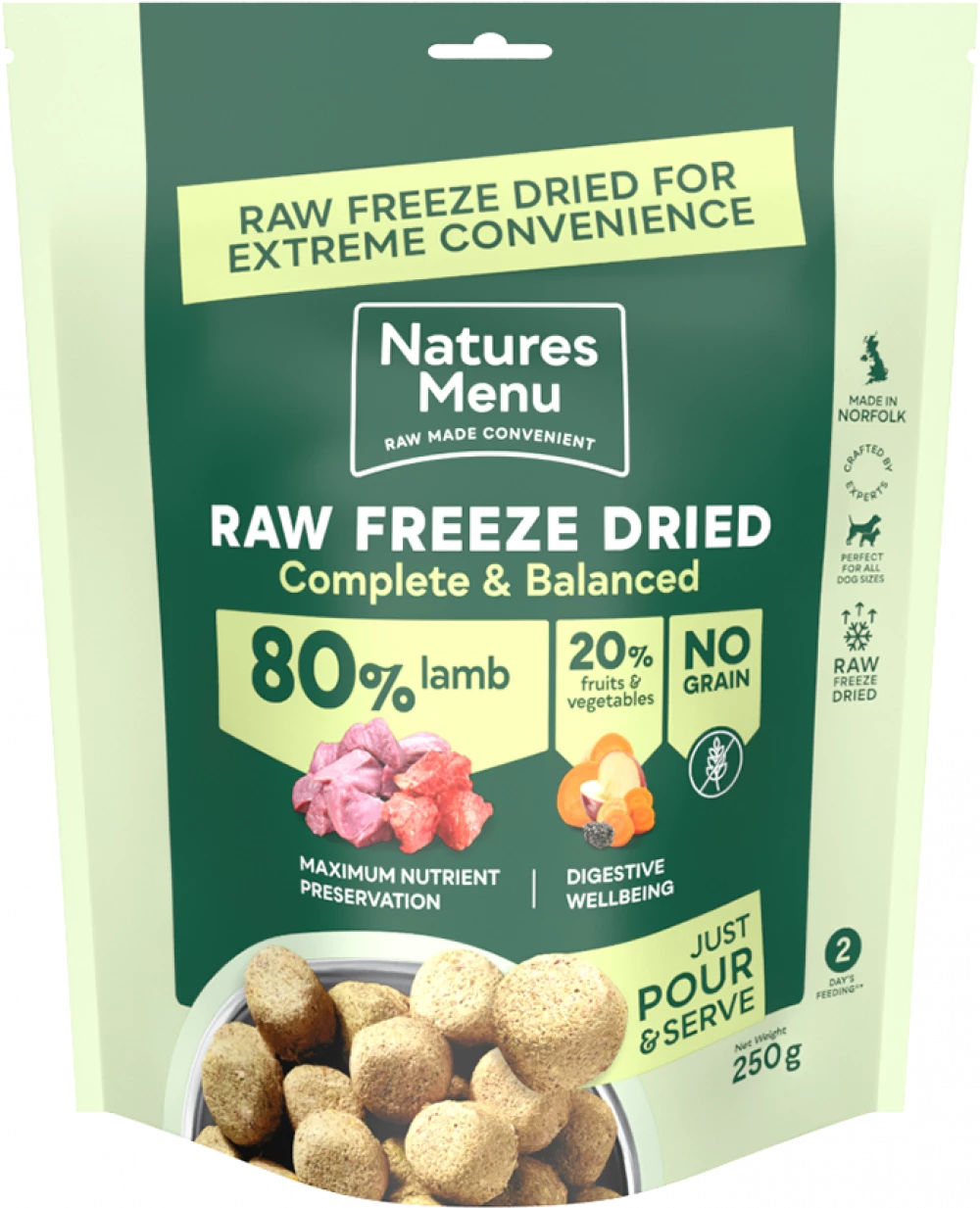 Delicious Complete and Balanced Freeze Dried dog food, made with 80% quality lamb, combined with fruits, vegetables and superfoods. Perfect for adult dogs of all sizes. Our Freeze-Dried complete meals are designed to meet all of dog’s nutritional needs, helping support digestive wellbeing, without the need for frozen storage or defrosting.