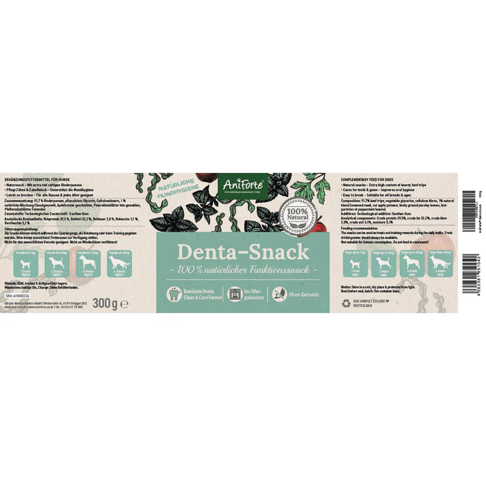 Dental Snacks are a tasty and highly digestible snack that is particularly tasty due to the extra high proportion of beef tripe. The biscuit-like meat snacks are combined with our unique AniForte® Denta Clean & Care recipe of natural ingredients such as seaweed meal, apple pomace, parsley and peppermint to help counteract tartar build-up and bad breath in your dog.