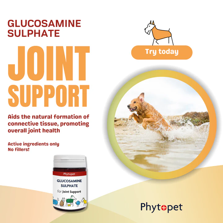 Phytopet glucosamine sulphate is formulated with human-grade Glucosamine, and Vitamin C, essential for joint repair and maintenance. This supplement is specifically designed to aid in the repair of connective tissues and to maintain joint function, particularly beneficial for conditions like arthritis, tendon and ligament damage.