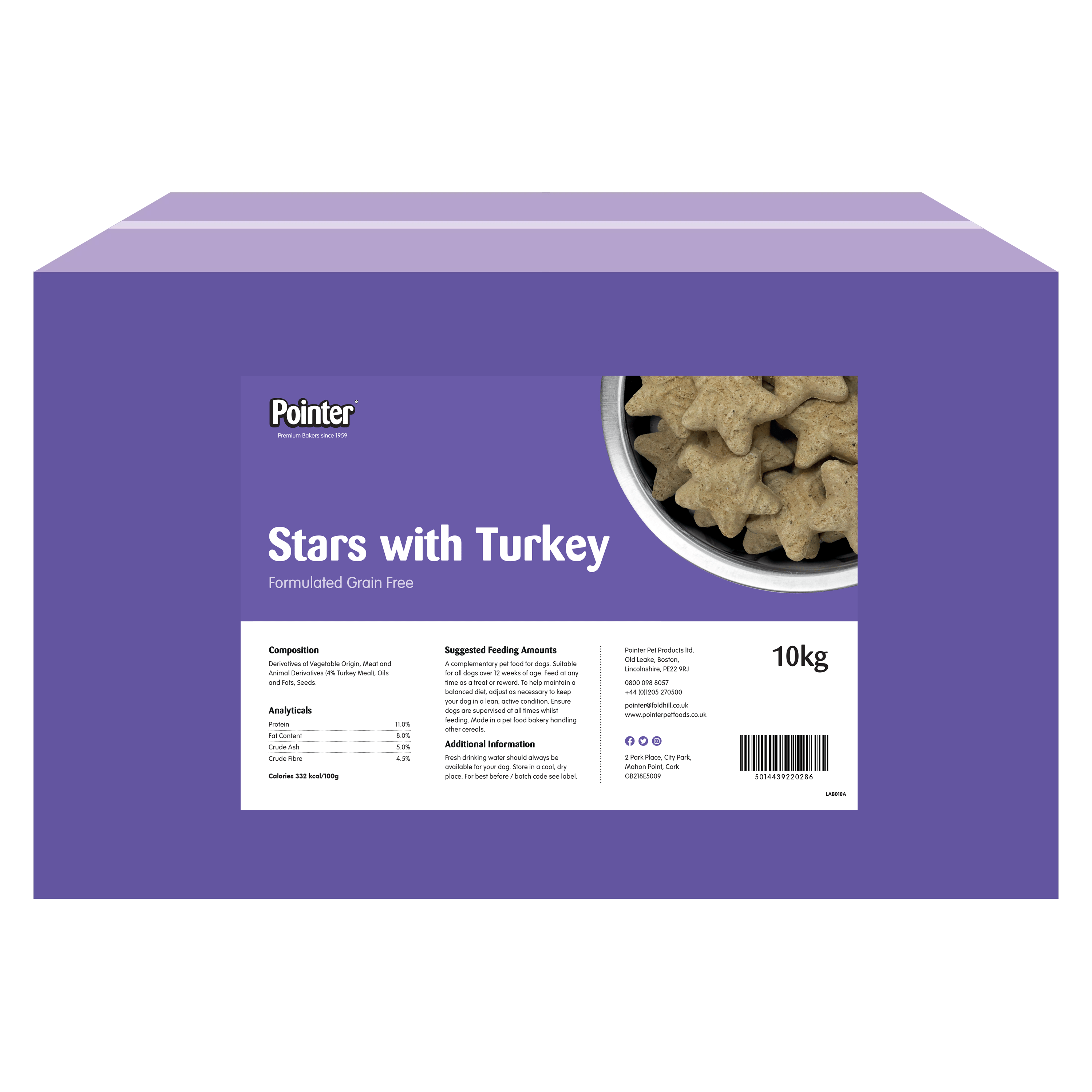 Grain free turkey stars are naturally oven-baked on a farm bakery in Lincolnshire. An ideal snack between meals or as a tasty training treat for dogs. These Pointer grain free turkey stars are made with no added artificial colours or flavours and are formulated grain free. Made with turkey – a tasty and easily digestible protein source with natural antioxidants, as well as linseed, which is rich in omega 3 and 6 to help maintain healthy skin, glossy coats and overall good immunity. Also, by gently oven-baking these grain free turkey stars, it gives them a extra crunchy texture to help keep teeth clean too!