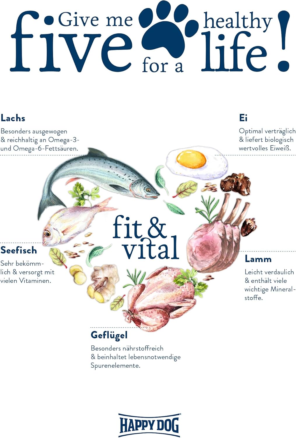 Would you like to provide your four-legged friend with an extra portion of health in a natural and balanced way? Then Happy Dog fit & vital is exactly the right thing for you – the five different protein components ensure a healthy variety of proteins, based on nature’s example: salmon, sea fish, egg, lamb and poultry. Salmon is rich in essential omega-3 and omega-6 fatty acids – ideal for skin and coat. Digestible sea fish provides the body with many vitamins, while egg, biologically valuable protein and lamb, provide many important minerals. The recipe is rounded off by particularly nutrient-rich poultry, which serves as a supplier of essential trace elements.