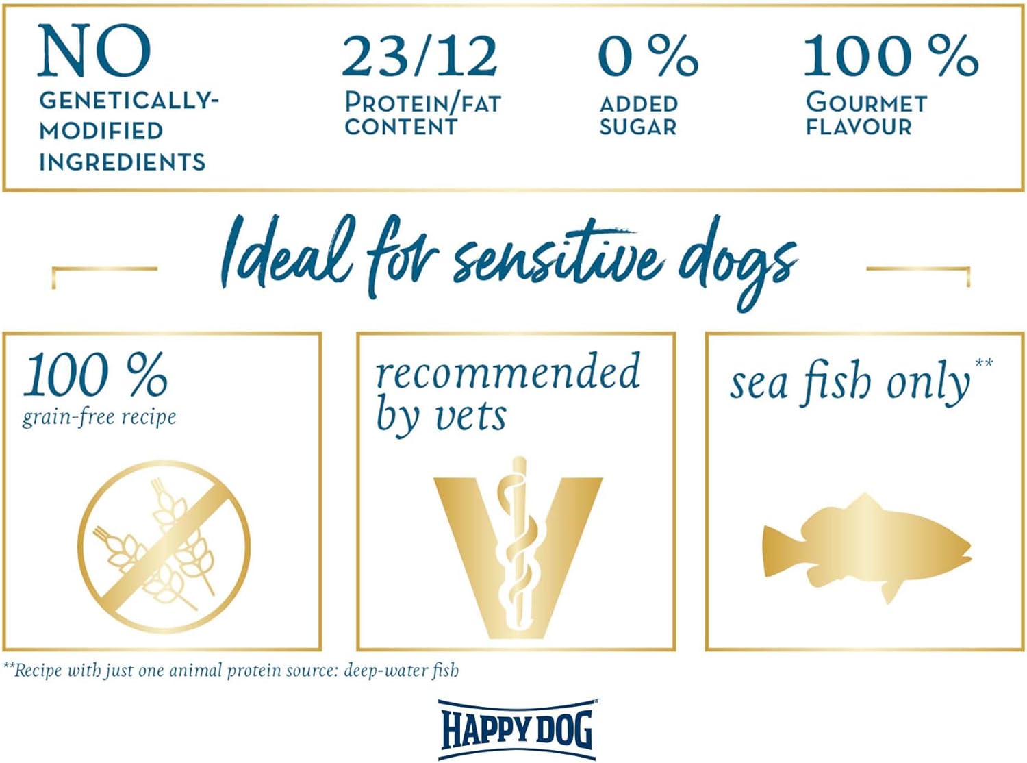 Complete food for all adult dogs with normal energy requirements. Happy Dog Supreme Caribbean is the grain-free gourmet indulgence made from exclusive raw ingredients derived from the special delicacies of Caribbean cuisine. Delicate salt-water fish from sustainable fisheries and highly digestible potatoes gently pamper your dog. And of course it is gluten-free. Deep-sea fish is the selected and very special protein source. With its moderate protein and energy content, this tasty recipe relieves the digestion and is very well tolerated by dogs from all breeds with food sensitivities. Valuable Omega-3+6 fatty acids – important for healthy skin and a shiny coat – round off the tropical enjoyment.