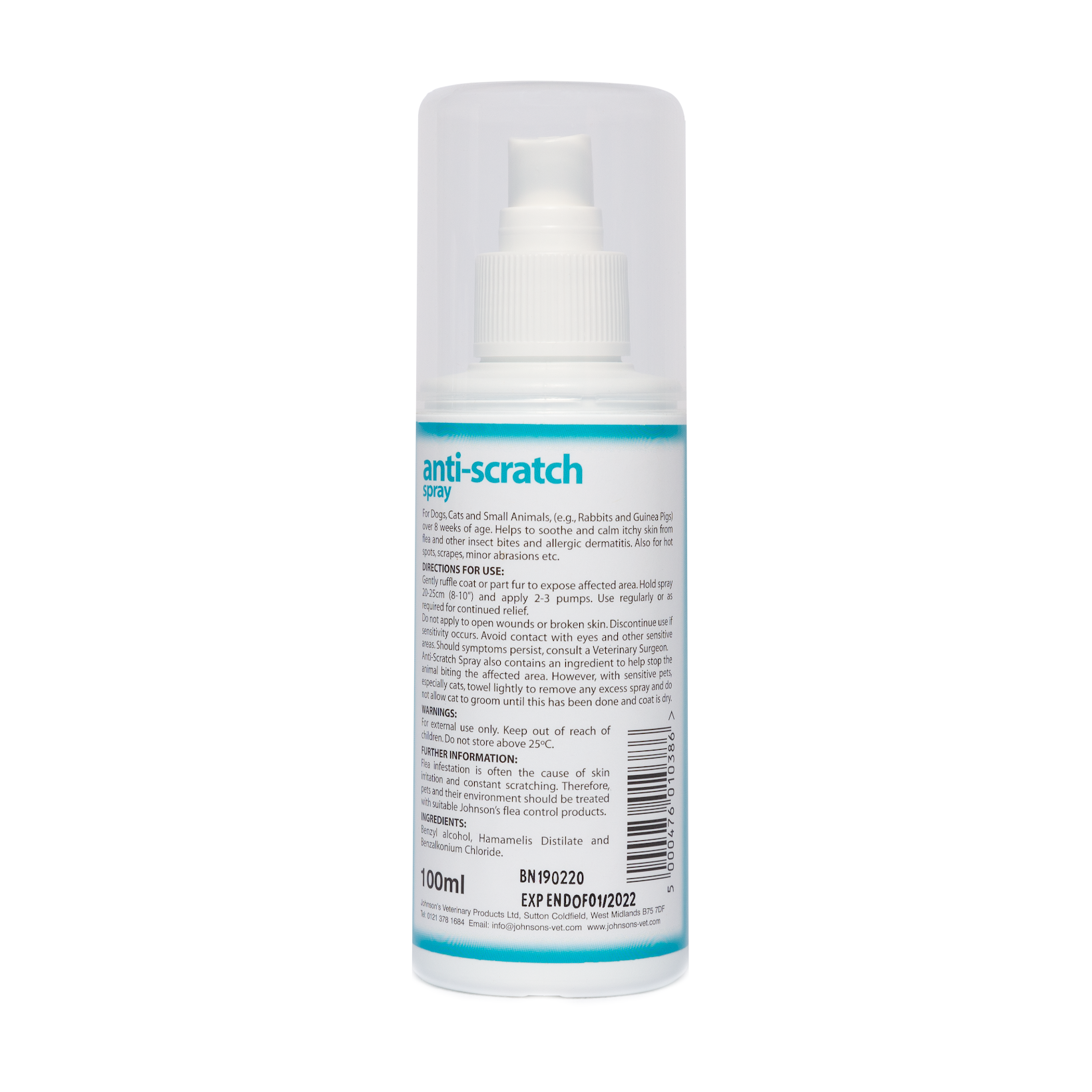 Soothes itching from hot spots, irritated skin, flea bites etc. Suitable for dogs and cats. 100ml pump spray