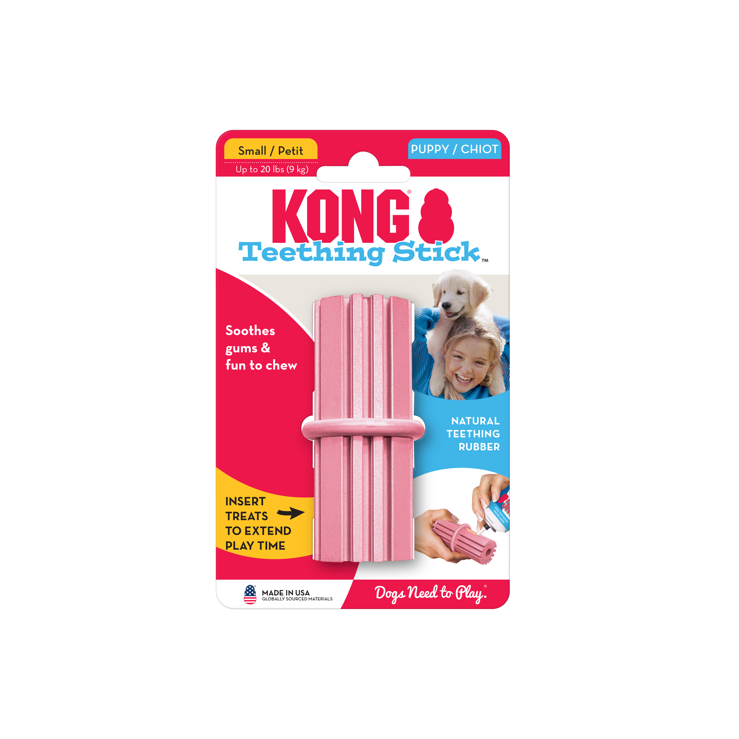 The KONG Puppy Teething Stick is made with unique KONG Classic puppy rubber. The ridges gently clean teeth and soothe sore gums when chewed. Fill them with Easy Treat or Peanut Butter to encourage long-lasting play sessions. Playing with the Puppy Teething Stick helps teach puppies appropriate chewing behavior. Use with puppies until they reach 9 months, then they can graduate to KONG Classic Rubber toys.