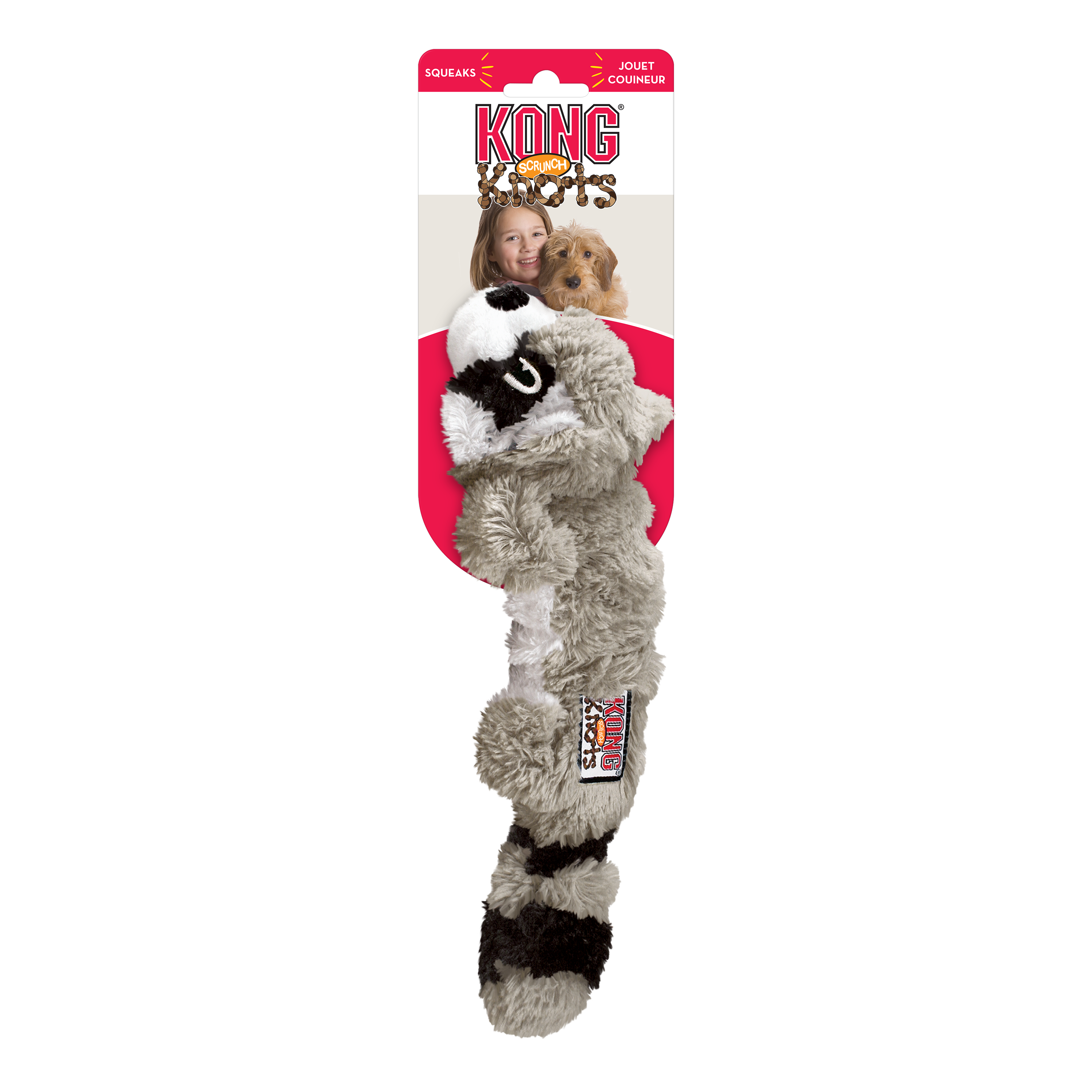 KONG Scrunch Knots are realistic pet toys that keep dogs coming back for more. Plush material scrunches around the internal coiled rope, while stretchy sides create natural movement to entice play. The internal knots satisfy natural instincts and these toys contain no stuffing for less mess. Squeaks for added enjoyment!
