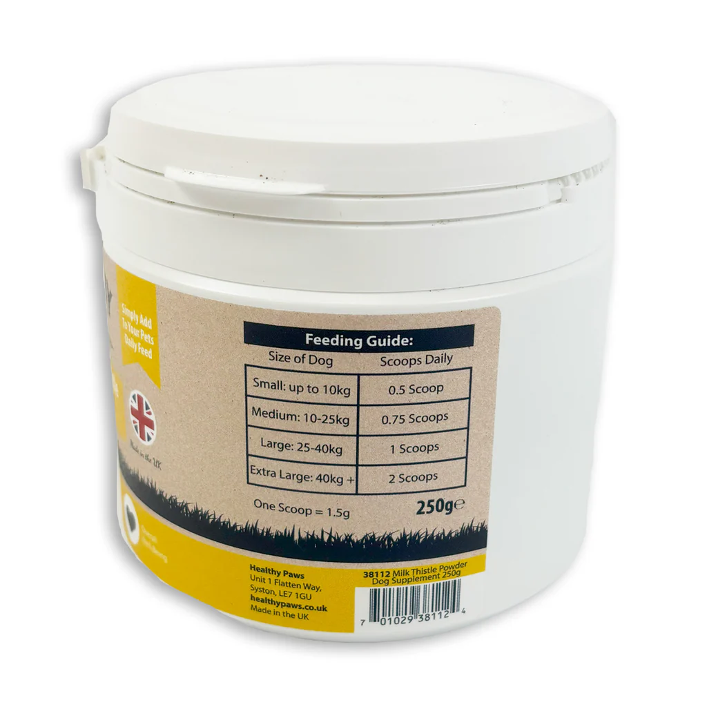 Milk Thistle Supplement for Dogs is a natural and effective way to support your furry friend’s liver health. Milk thistle is renowned for its liver-protective properties. This fantastic powder contains a high concentration of silymarin, a powerful antioxidant that helps shield the liver from toxins and environmental stressors. Silymarin also acts as a potent antioxidant, neutralising free radicals and contributing to a healthier immune system. This can be particularly beneficial for dogs facing oxidative stress or ageing-related concerns.