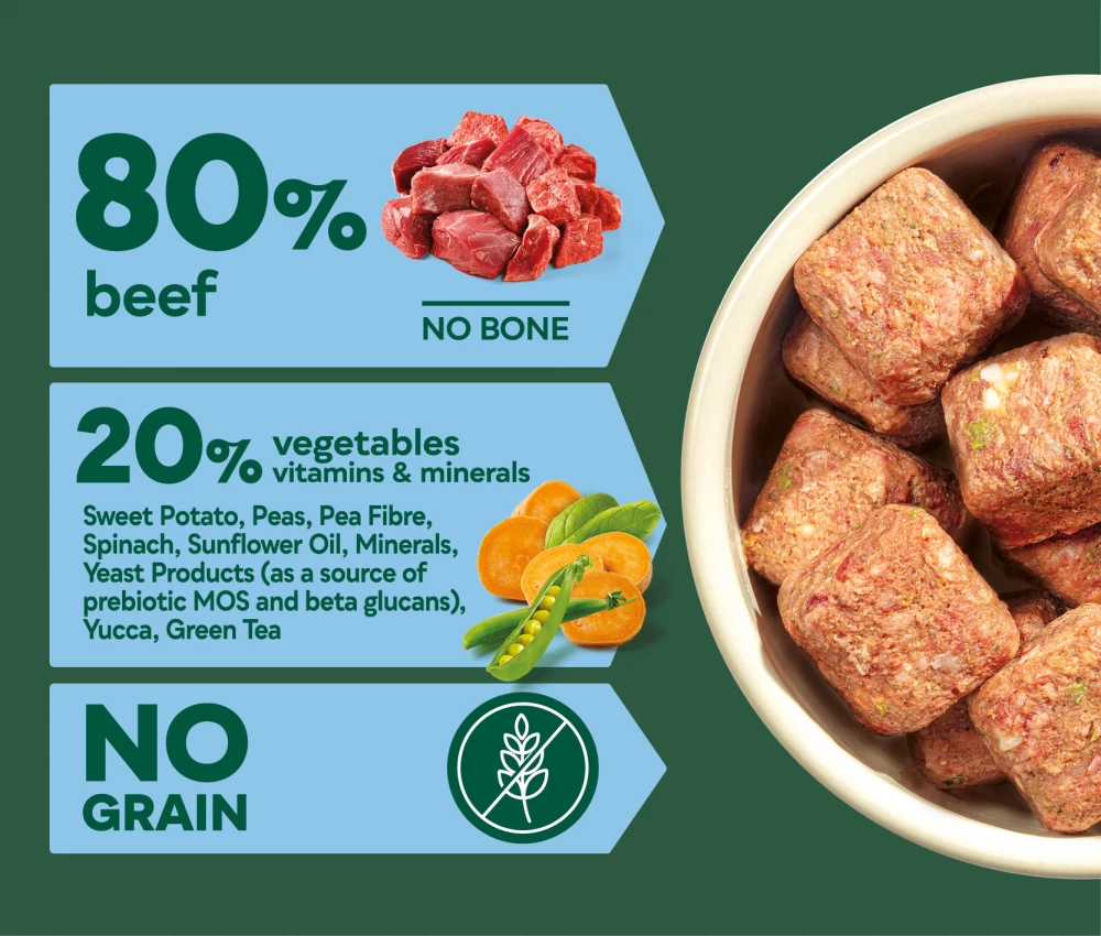 Want a delicious and nutritious raw beef puppy food for your pup? Try our seriously meaty, complete and balanced nuggets, made with 80% beef and blended with delicious sweet potato and spinach.