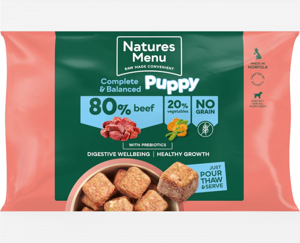 Our Natures Menu Complete & Balanced 80/20 beef puppy food is suitable from weaning and packed with high quality ingredients to give your growing pup everything they need to support digestive wellbeing and healthy growth.