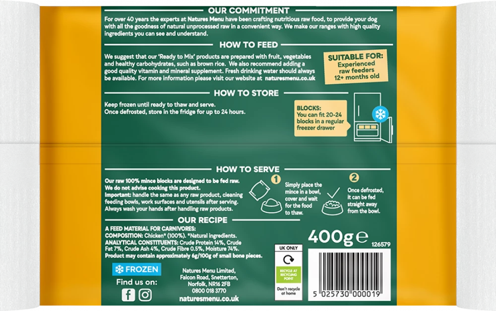 Just Chicken Raw Mince is an ingredient, not a complete meal. Add it to other ingredients to make balanced and nutritious raw meals at home.