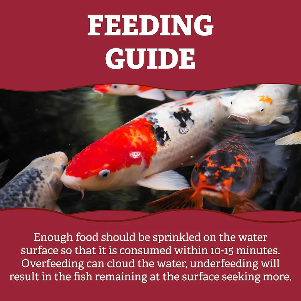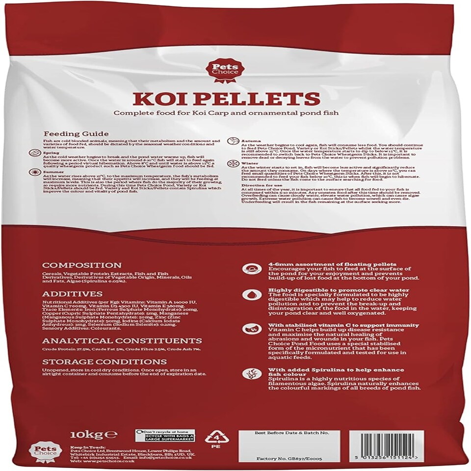 Pets Choice | Fish Food, Koi Carp Pellets | Floating, Highly Digestible & Non-Clouding | Added Spirulina to Enhance Colour (10kg) KOI CARP PELLETS – Added stabilised vitamin C which helps build up disease resistance and maximise the natural healing of abrasions and wounds in your fishFEEDING GUIDE – Suitable for feeding in Spring, Summer & Autumn where water temperatures are 10°C+. Sprinkle enough food on the water surface to be consumed within 10-15 minutes. Overfeeding can cloud the water, underfeeding will result in the fish remaining at the surface seeking moreHIGHLY DIGESTIBLE – The food is specially formulated to reduce water pollution and to prevent the break-up and disintegration of the food in the water, keeping your pond clear and well oxygenatedNON-CLOUDING – The food is specially formulated to be highly digestible to reduce water pollution and to prevent the break-up and disintegration of the food in the water, keeping your pond clear and well oxygenatedFLOATING – Encourages your fish to feed at the surface of the pond for your enjoyment and prevents build-up of lost food at the bottom of your pondSPIRULINA – A highly nutritious species of filamentous algae from Mexico. Spirulina is a natural colour enhancer that strengthens the coloured markings of all breeds of pond fishTHE COMPLETE RANGE – The Pets Choice selection of fish foods have been a firm favourite for many years. Featuring staple and specialist foods for all types of pond fish, all recipes are carefully formulated, utilising the highest quality ingredientsProduct DescriptionA complete food suitable for all pond fish whilst being specifically formulated to benefit Koi Carp, containing all the essential nutrients, vitamins and trace elements required by Koi with added stabilised Vitamin C to ensure healthy growth and a strong immune system. Increased levels of Spirulina and Carotenoids enhance the Koi’s naturally bright colours. The highly palatable floating pellets encourage Koi to feed from the surface, giving you the opportunity to enjoy great visibility of your Koi. The Koi Pellets soften quickly to allow easily feeding and are highly digestible to help maintain good water quality. This lower level of water pollution will also help reduce algae and maintenance. Contains no artificial colours or preservatives. Ideal for Koi Carp, but also suitable for all types of surface-feeding pond fish when water temperatures are above +12’C. Only feed as much as you fish can consume within 2-3 minutes. Remove any uneaten food after 3 minutes to prevent overfeeding.Highly Digestible Specially formulated to reduce water pollution and to prevent the break-up and disintegration of the food in the water, keeping your pond clear and well oxygenatedFloating Encourages your fish to feed at the surface of the pond for your enjoyment and prevents build-up of lost food at the bottom of your pondNon-Clouding Highly digestible to reduce water pollution and to prevent the break-up and disintegration of the food in the water, keeping your pond clear and well oxygenatedAdded Spirulina A highly nutritious species of filamentous algae from Mexico. Spirulina is a natural colour enhancer that strengthens the coloured markings of all breeds of pond fishPets Choice Koi Pellets (10kg)Pets Choice Koi Sticks (5kg)Pets Choice Multi Sticks (5kg)Pets Choice Pond Pellets (10kg)Pets Choice Pond Sticks (5kg)Pets Choice Wheatgerm Sticks (5kg)
