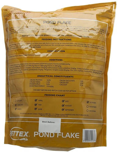 Pettex Pond Flake is a high-quality food suitable for all coldwater fish including Koi, Orfe, Carp, Goldfish and many other species. This highly digestible and balanced formulation gives your fish the healthy diet they require together with spirulina to heighten the fish’s colour. The balanced formula avoids the need for overfeeding and so reduces possible water pollution. Pettex Pond foods mimic some of the natural shapes that fish are accustomed to, this combined with a prolonged floating period encourages your fish to feed more eagerly. Pettex Pond Foods have a carefully selected protein level to minimise waste and ammonia build-up for reduced health risks to your fish and easier pond maintenance.