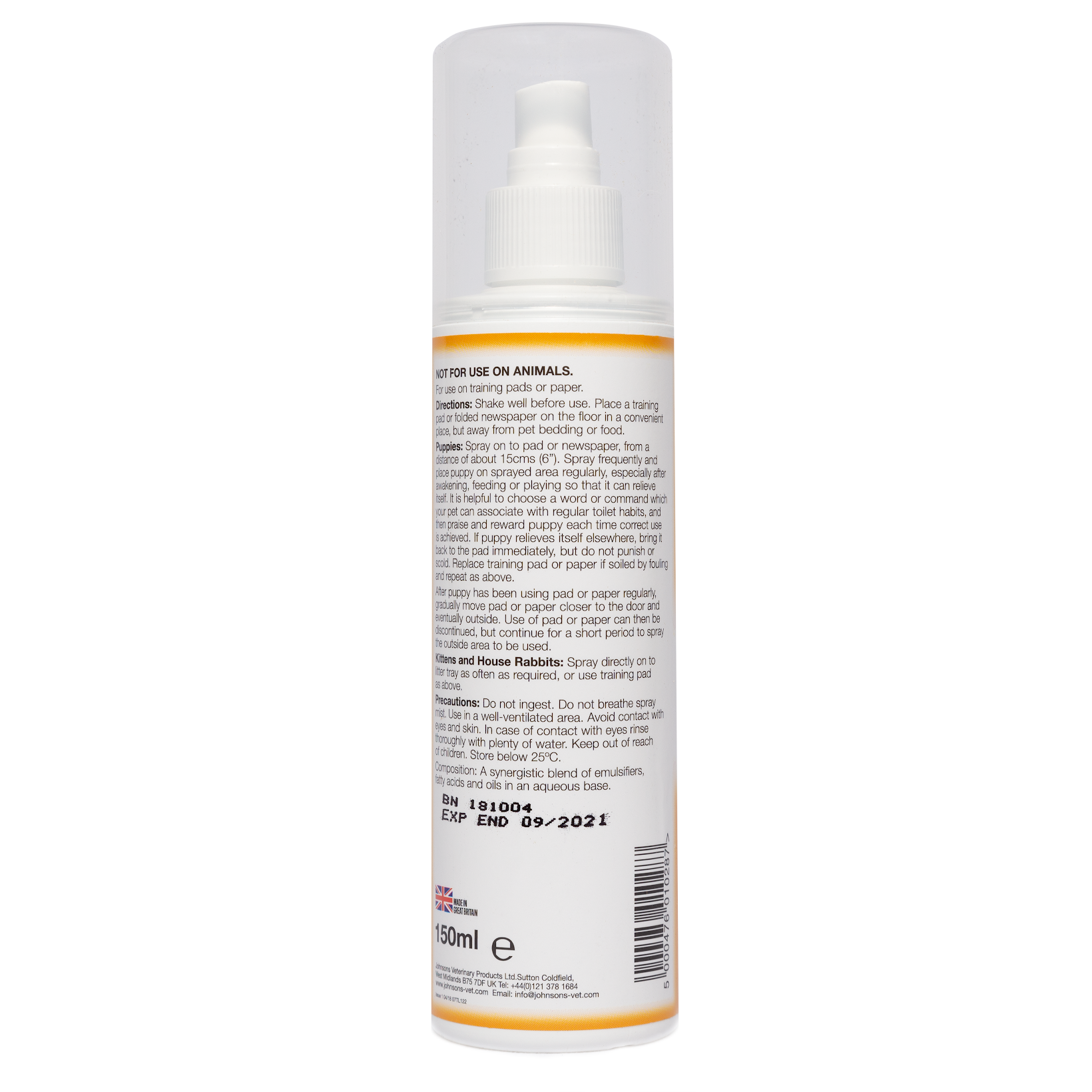 New improved pump spray for house training puppies and kittens. Ideal to use with Clean ‘n’ Safe House-Training Pads. 150ml pump spray
