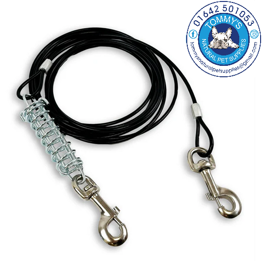 This Tie Out Cable for dogs is an essential accessory to ensure that your furry friend is both safe and secure whilst enjoying the outdoors. Perfect for use in the garden, at the park, or during outdoor outings, this tie out cable offers your dog the freedom to roam and play within a controlled area. Made from a strong steel cable wrapped in a durable, waterproof plastic coating, it is built to withstand the elements and provide long lasting use. The weather resistant coating protects the cable from wear and tear, ensuring it remains functional through various outdoor conditions from rain to sunshine!