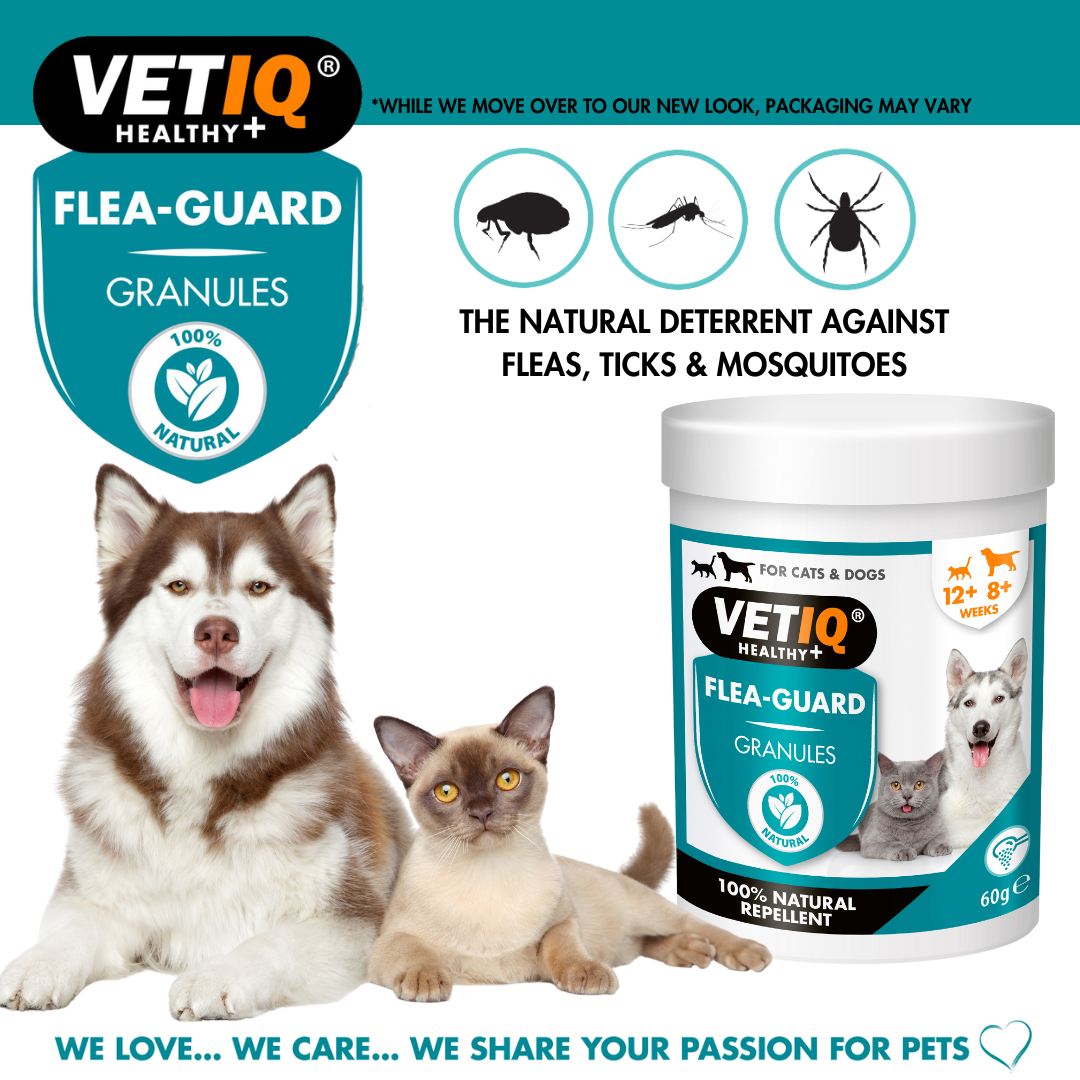VETIQ Flea Guard™ granules is a 100% natural treatment & deterrent for fleas, ticks & mosquitoes to keep your pet pest free. Easy & safe to use, it contains a blend of B vitamins, yeast, zinc and garlic to deter pesky insects while also reducing soggy smells. It also keeps your pet’s coats glossy & skin healthy.